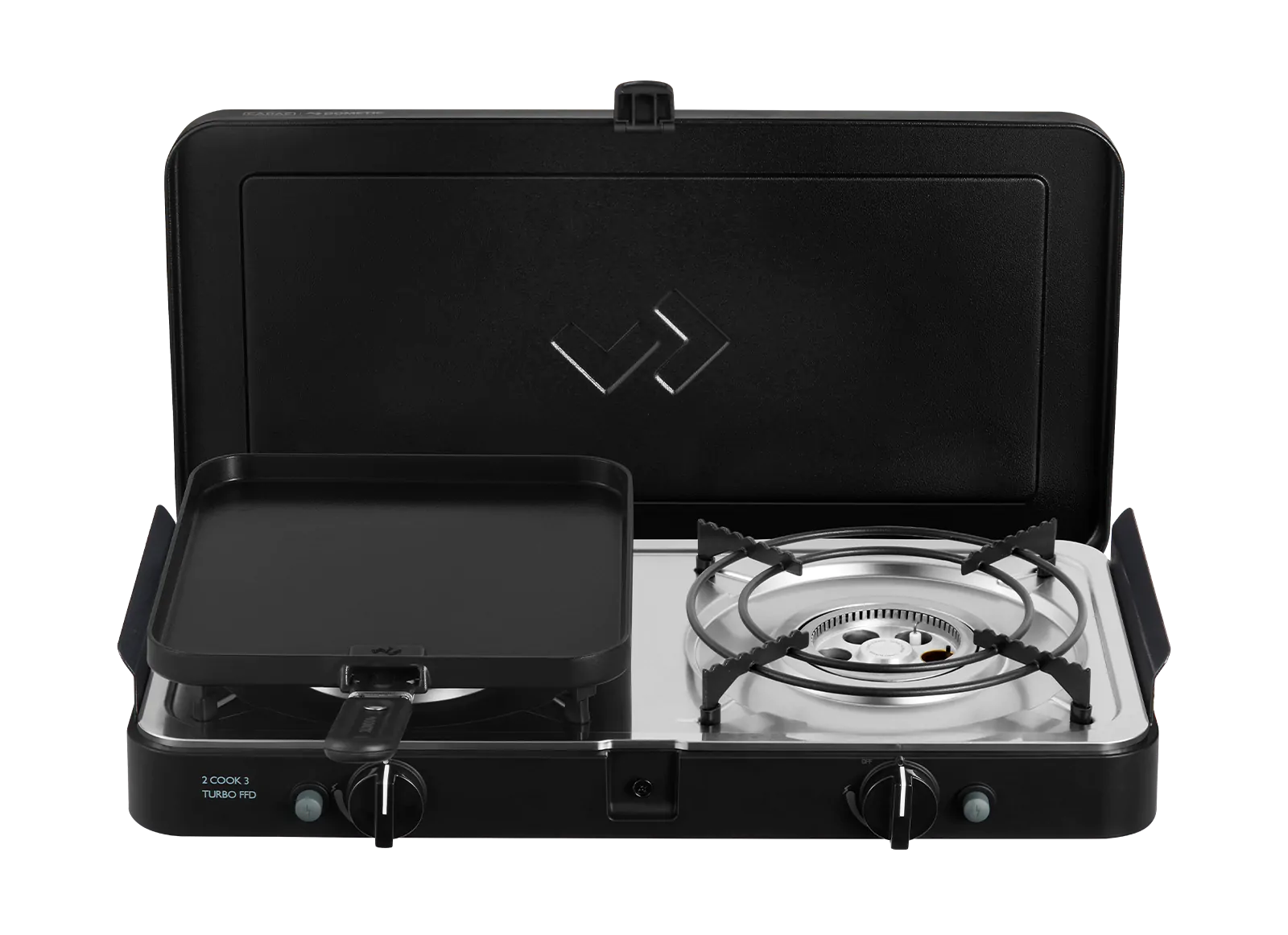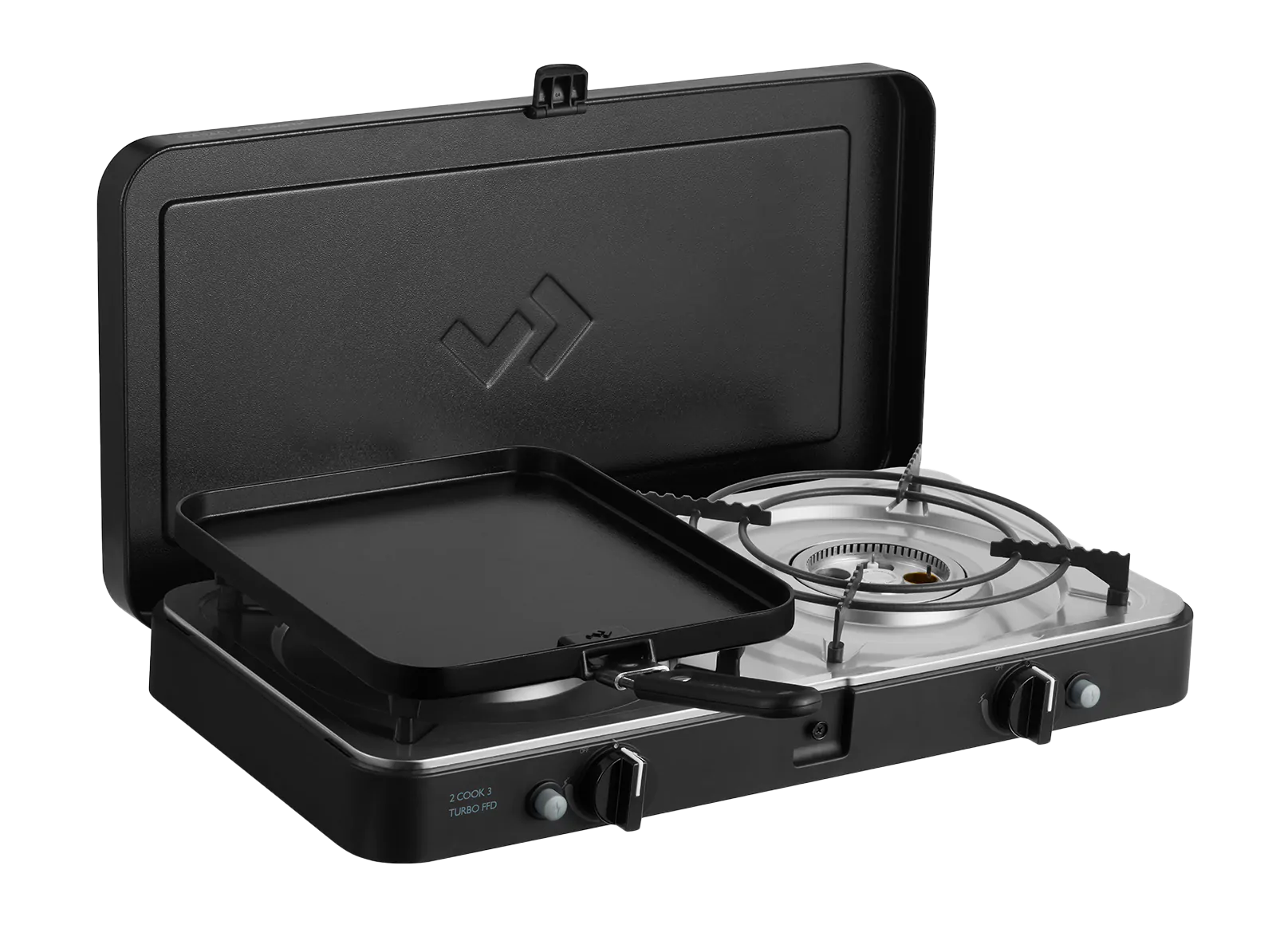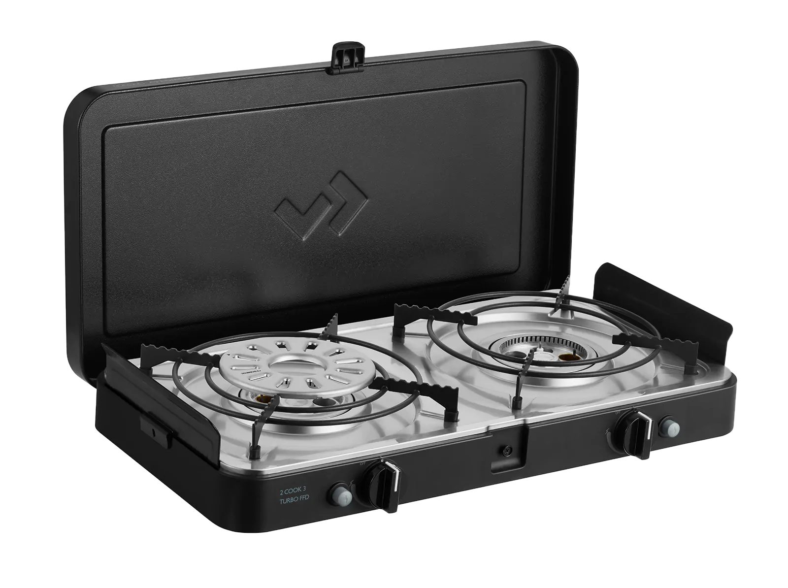 Das einzigartige Design der Turbo-Brenner sorgt für eine stärkere und gezielte Wärmeabgabe. Dies sorgt für eine schnellere Aufheizzeit als bei anderen Kochern und kann die Kochzeit und den Gasverbrauch um bis zu 40 % reduzieren. Die beiden Brenner befinden sich tief im Gerät, was zu einem schlanken Design führt, bei dem die Brenner weniger empfindlich auf Windböen reagieren. Die Brenner arbeiten unabhängig voneinander und haben jeweils einen eigenen Bedienknopf und eine eigene Zündung.
