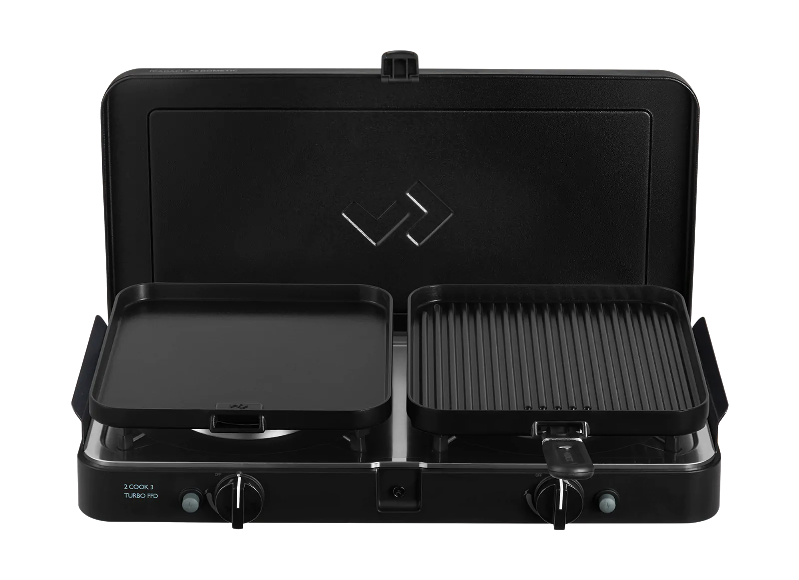 Der 2 Cook 3 Turbo ist serienmäßig mit zwei Topfständern und seitlichen Windschutzblechen ausgestattet. Die Deluxe-Version ist zusätzlich mit einer flachen und einer gerippten Platte mit abnehmbarem Griff zum einfachen (Wieder-)Aufsetzen der Grillplatten ausgestattet. Beide Platten sind mit der GreenGrill-Keramikbeschichtung von CADAC ausgestattet. Ein Kaffeekannenständer ist ebenfalls enthalten. Es gibt also unendlich viele Möglichkeiten, eine köstliche Mahlzeit zuzubereiten, und gleichzeitig backen, grillen, (Kaffee)kochen, usw.