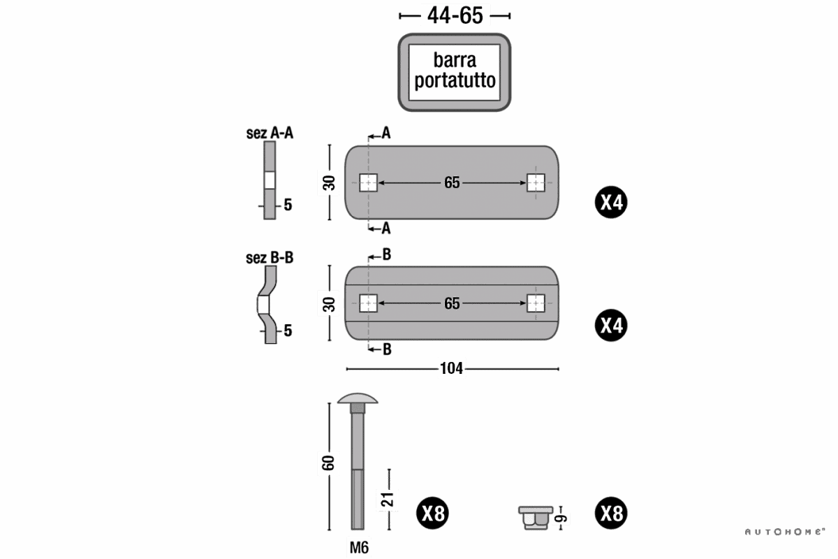 Das Befestigungsset von Autohome ist ist als Ersatzteil, aber auch für spezielle Montage-Fälle geeignet. Bei extra-breiten Dachträgern, z.B. Thule Wingbar, passt das Standard-Befestigungsset (Größe „M“) von Autohome nicht für die Montage. Dafür gibt es mehrere Varianten mit längeren Metallschienen und Schlossschrauben.
