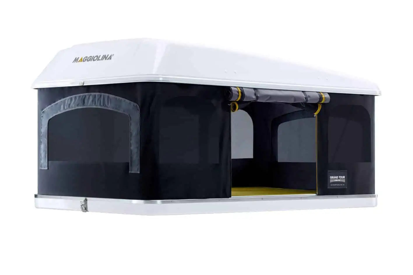 Vergeleken met zijn "broer", de Maggiolina Grand Tour, biedt de tent met harde schaal een beter zicht zonder gezien te worden. De metalen schaar aan de voor- en achterkant verkleint de maat van de matras tot ongeveer 1.85m x 1.40m.