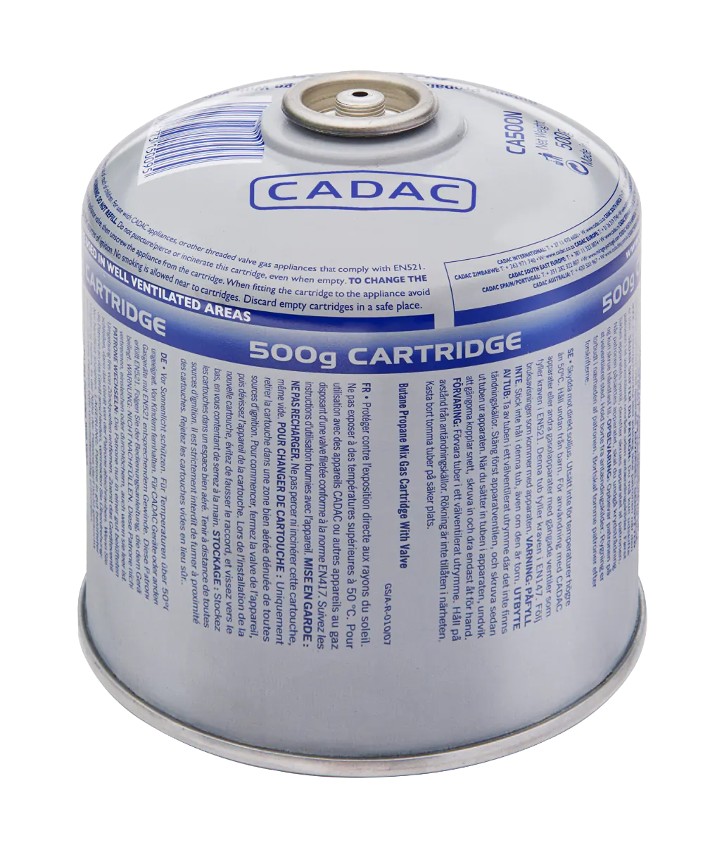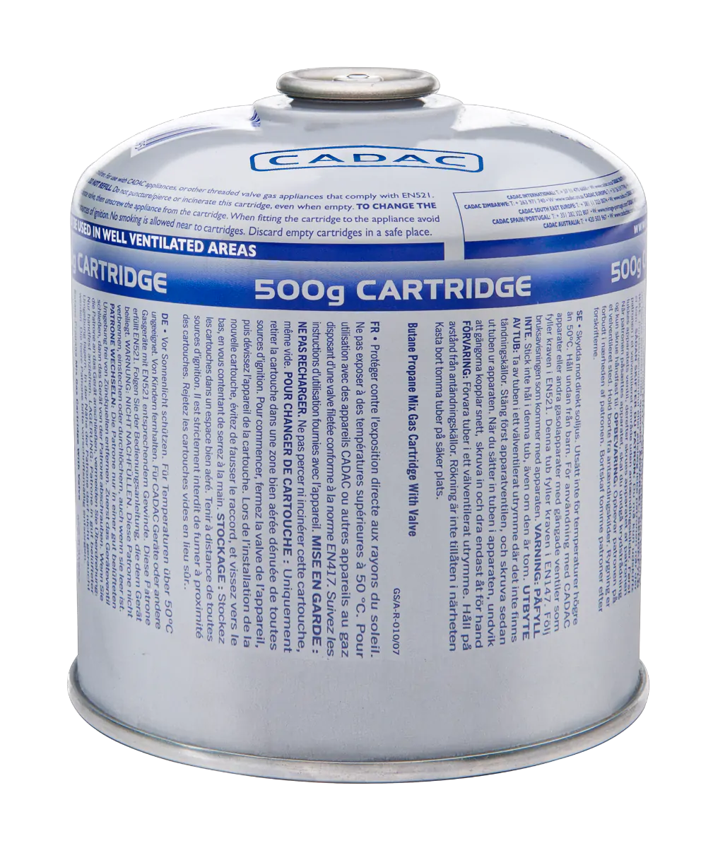 Gaskartusche mit Butan-/Propangas, mit Standard-EN417-Schraubgewinde und Sicherheitsventil. Der Inhalt dieser Gaskartusche beträgt 500g (1000 ml).