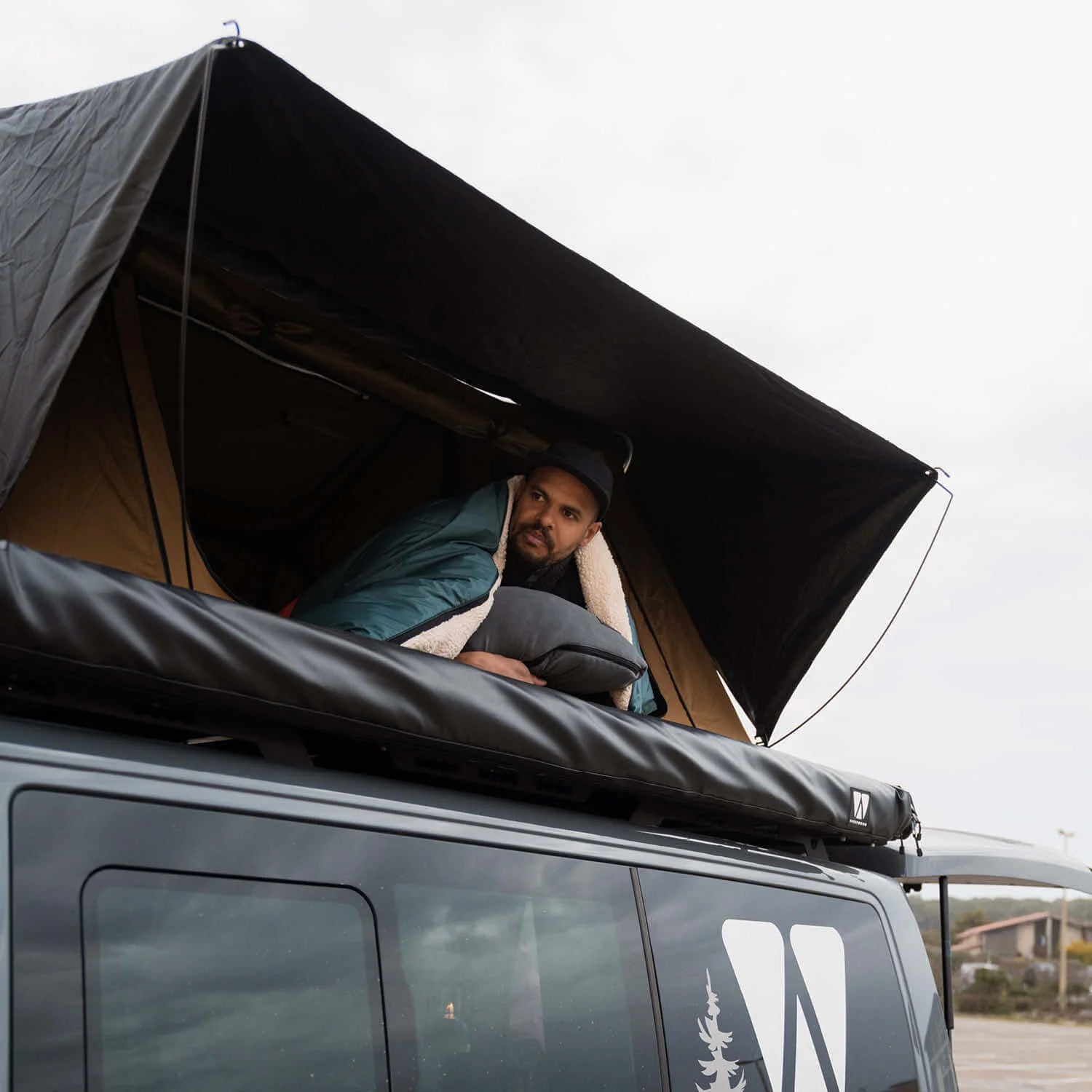 Mit dabei sind außerdem eine abnehmbare schwarze Aluminiumleiter, eine wasserabweisende Matratze und praktische Aufbewahrungslösungen wie Schuhtaschen und Moskitonetze. Das Dachzelt ist in einem goldbraun/grauen Farbton gehalten, die Regenhülle ist schwarz.