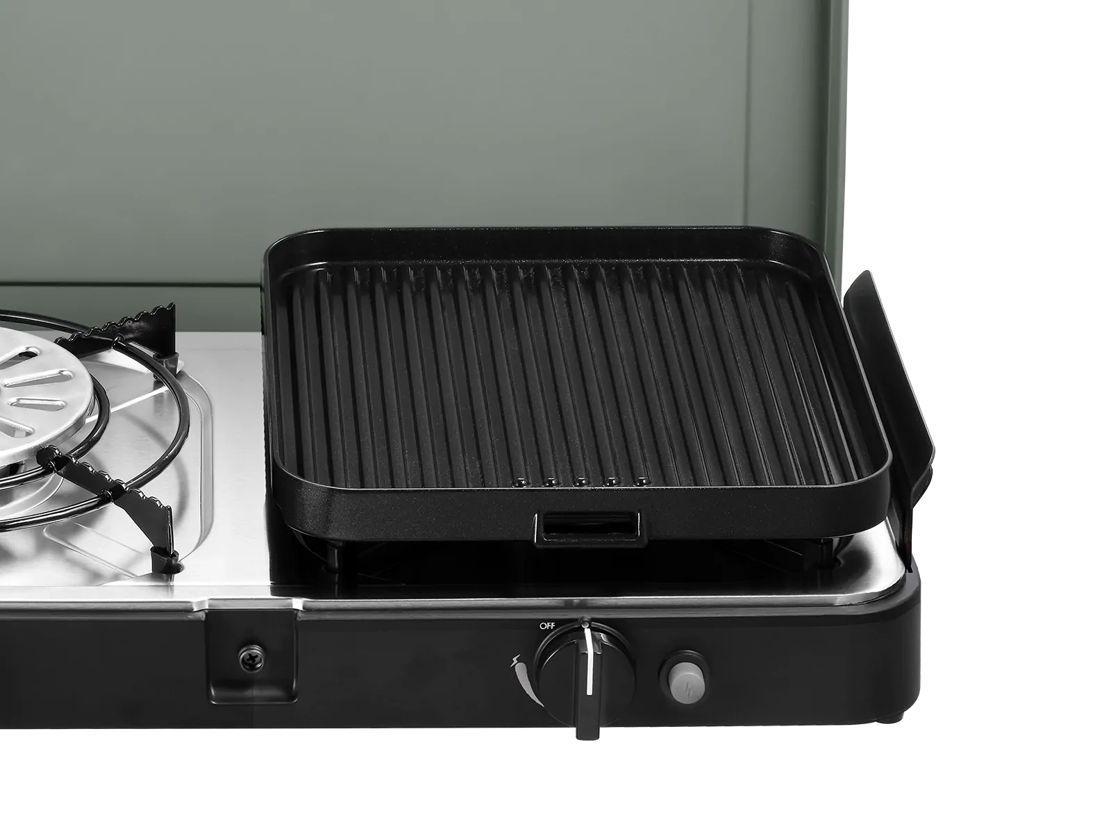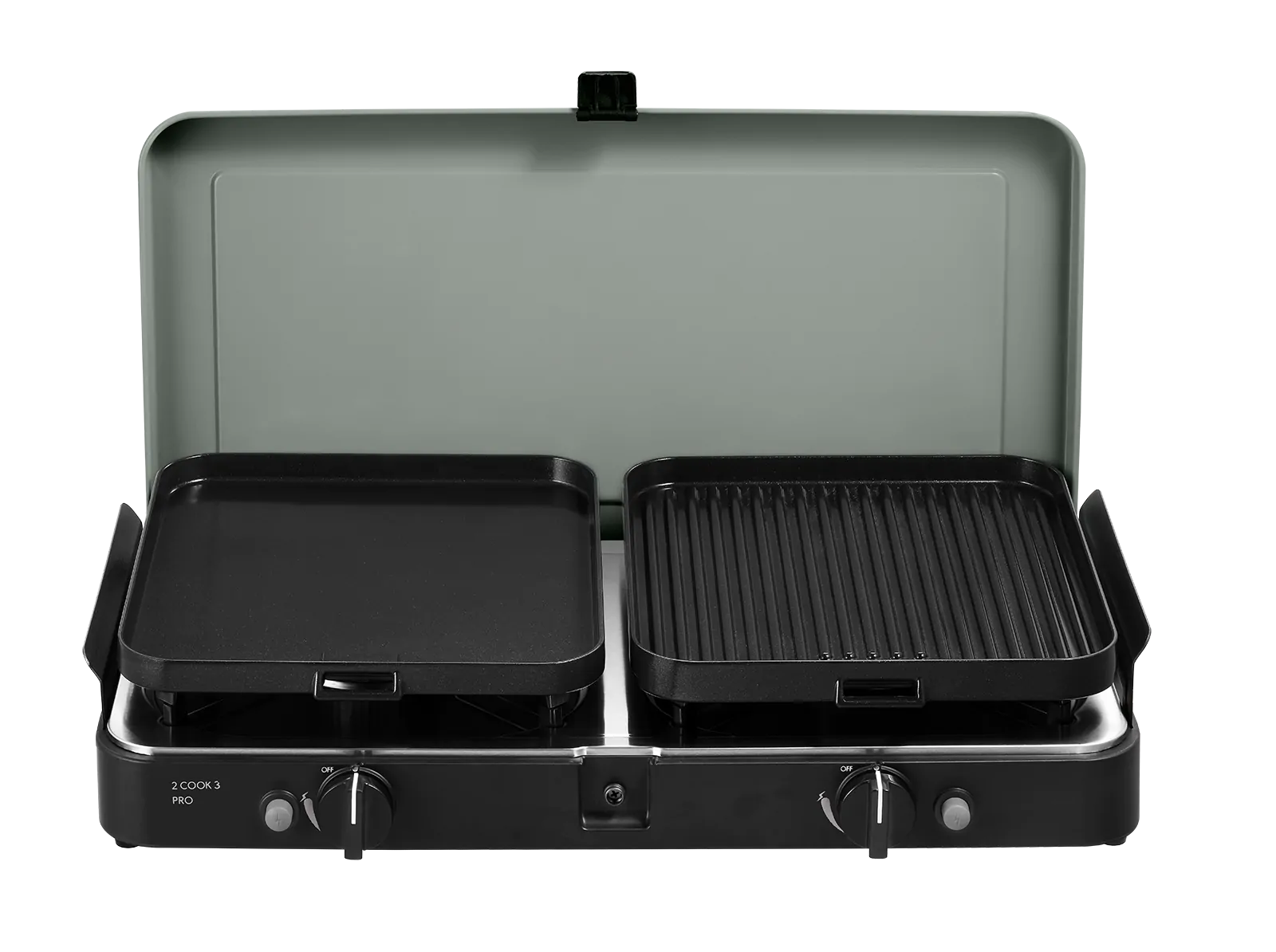 Der 2 Cook 3 Pro Deluxe Campingkocher wird mit zwei Topfständern und Windschutzblechen geliefert. Für zusätzliche Kochmöglichkeiten gibt es auch zwei separates Grillplatten (eine glatt und eine gerippt). Die abnehmbaren Windschutzbleche an den Seiten verhindern, dass die Gasflamme während des Kochens ausgeht. Nach dem Gebrauch kann der Deckel des Kochers wieder mit dem praktischen Verschlussclip geschlossen und in der mitgelieferten Trage-/Aufbewahrungstasche verstaut werden. Beachte jedoch, dass die Gasflasche, und der Druckregler nicht im Lieferumfang enthalten sind! Mit dem 2 Cook 3 Pro Deluxe Campingkocher erhältst du zusätzlich zwei Topfständer mit Gummifüßen, eine flache Platte und eine gerippte Platte, sowie einen Kaffeekannenständer. Beide Platten sind mit einer GreenGrill-Keramikbeschichtung versehen und können mit einem separaten Griff welchen wir dir dazu liefern, abgenommen werden.