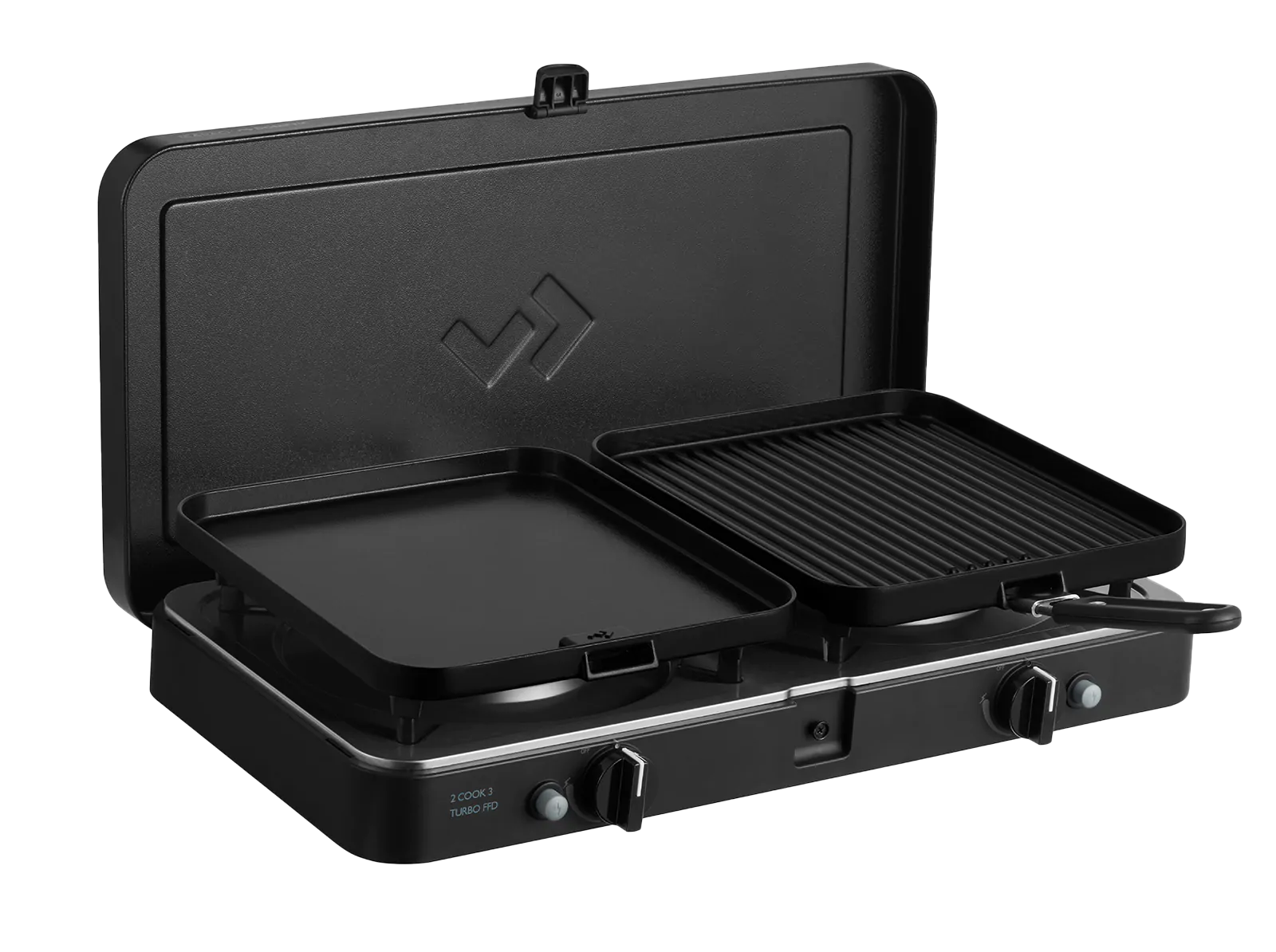 Der 2 Cook 3 Turbo ist serienmäßig mit zwei Topfständern und seitlichen Windschutzblechen ausgestattet. Die Deluxe-Version ist zusätzlich mit einer flachen und einer gerippten Platte mit abnehmbarem Griff zum einfachen (Wieder-)Aufsetzen der Grillplatten ausgestattet. Beide Platten sind mit der GreenGrill-Keramikbeschichtung von CADAC ausgestattet. Ein Kaffeekannenständer ist ebenfalls enthalten. Es gibt also unendlich viele Möglichkeiten, eine köstliche Mahlzeit zuzubereiten, und gleichzeitig backen, grillen, (Kaffee)kochen, usw.