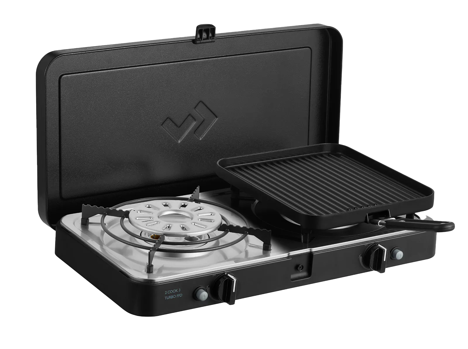 Das einzigartige Design der Turbo-Brenner sorgt für eine stärkere und gezielte Wärmeabgabe. Dies sorgt für eine schnellere Aufheizzeit als bei anderen Kochern und kann die Kochzeit und den Gasverbrauch um bis zu 40 % reduzieren. Die beiden Brenner befinden sich tief im Gerät, was zu einem schlanken Design führt, bei dem die Brenner weniger empfindlich auf Windböen reagieren. Die Brenner arbeiten unabhängig voneinander und haben jeweils einen eigenen Bedienknopf und eine eigene Zündung.