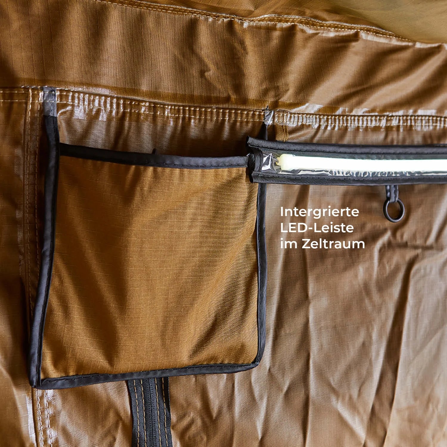 Großzügige Fenster mit flexiblen Moskitonetzen sorgen für eine helle Atmosphäre und frische Luft, während du sicher vor Wind und Regen geschützt bist. Ob zum Kochen, Essen, für gesellige Runden oder einfach zum Entspannen – der VICKYWOOD Zeltraum schafft einen gemütlichen Rückzugsort, selbst wenn das Wetter nicht mitspielt.