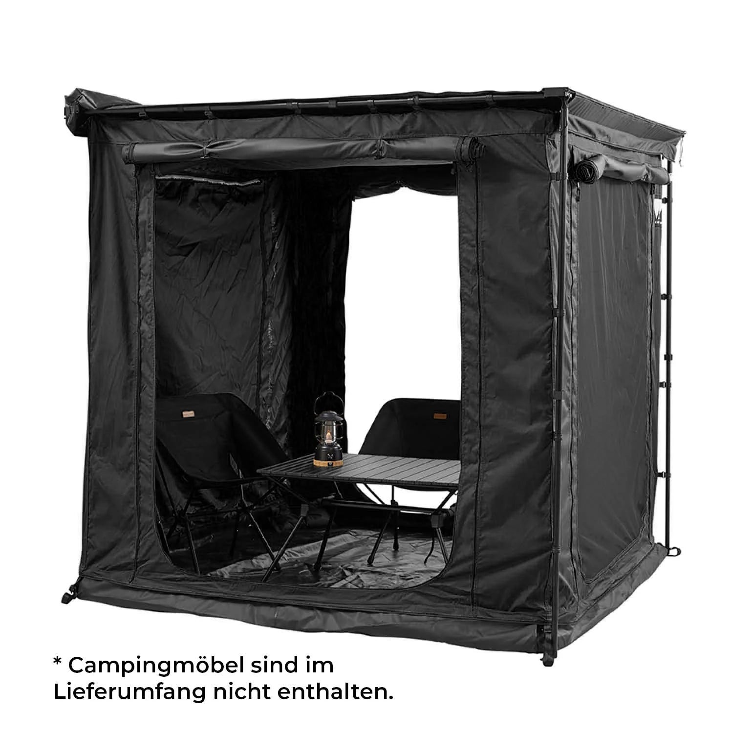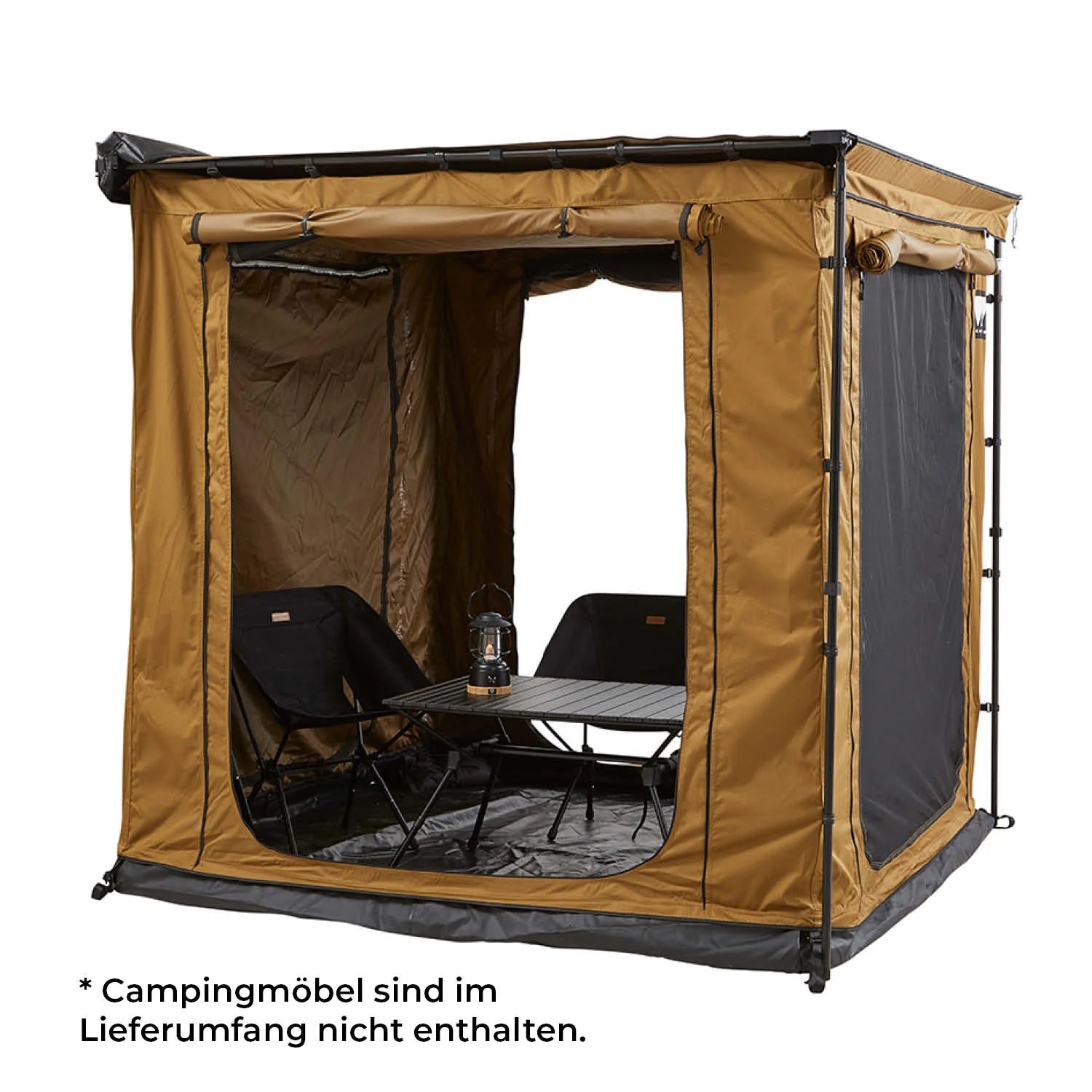 Der VICKYWOOD Zeltraum ist die ideale Erweiterung für deine VICKYWOOD Markise und bietet dir eine effektive Lösung bei schlechtem Wetter. Mit wenigen Handgriffen wird der Anbau an deiner Markise befestigt und verwandelt den Außenbereich in einen geschützten, komfortablen Raum mit Boden und Decke.